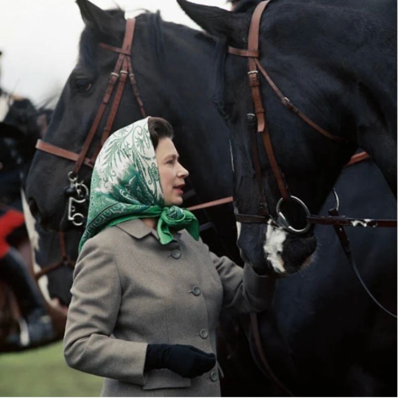 Did you know that QE2 would often tuck a scarf into her jacket? She would always have one handy at casual events. This would add a pop of color while maintaining a uniform look.
